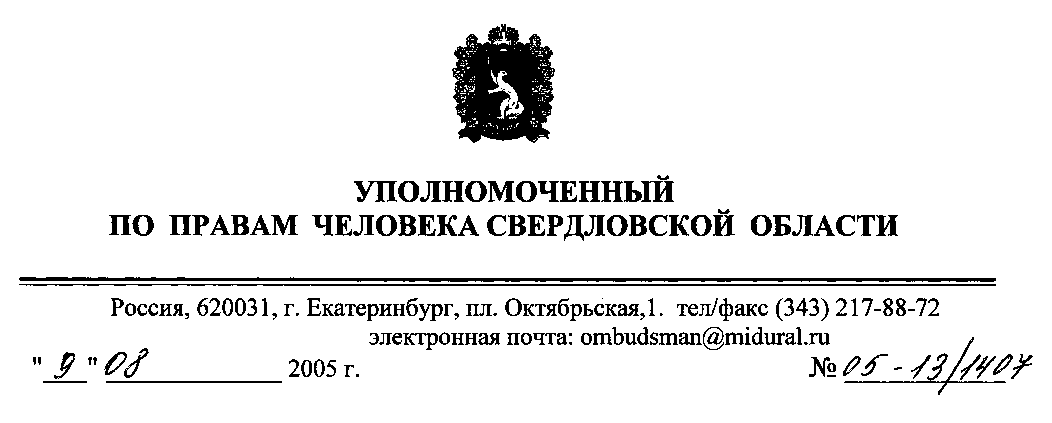 Мое обращение к Уполномоченному по правам человека Свердловской области Мерзляковой Т.Г. от 05.08.05