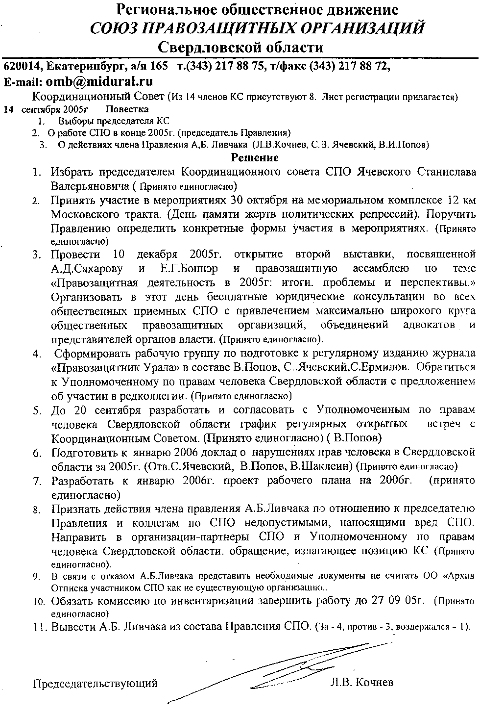 9 Насколько я понимаю, имеется в виду Л.В.Кочнев, которого Попов вскоре назначил и.о.председателя (см. приказ от 04.08.05). Вот, собственно, ради кого старался хитроумный Попов. Сначала сорвал выполнение работ по гранту, а теперь предлагает поставить во главу проекта своего человечка. Кстати, вот любопытная цитата, которая, возможно, многое объяснит: «Наши источники в Белом Доме рассказывают, что "королевской" пешкой в руках Багарякова оказался председатель ревизионной комиссии Свердловского регионального отделения СПС Леонид Кочнев… Личность Багарякова в "правых" кругах известна своей скандальной репутацией. Он - предприниматель из Нижнего Тагила …. Наши источники сообщают, что свой интерес в Багарякове имела администрация губернатора, которая всегда мечтала приручить правых, у которых высокие рейтинги в области. … Когда СПС и Яблоко ослабли, их недоброжелатели решили, видимо, что наступил удобный момент для удара. Как сообщил "Урал Паблисити Монитор" член политсовета СПС Владимир Попов, сочувствующий Кочневу, "в стане правых, кроме скандалов, ничего не происходит. …". Сегодня налицо очередной раскол в СПС. Наши источники … уверяют, что Попов - креатура областной власти. Он работает с уполномоченным по правам человека Татьяной Мерзляковой и именно он на данный момент по просьбе Багарякова контролирует Кочнева.» (UP-Monitor, Анна ДOHCKAЯ, http://www.upmonitor.ru/index.php?pg=lz&hid=149&PHPSESSID=966e7f85c4646716c9e14bf4290b795d)