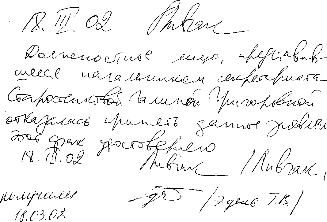 12.03.02 я был в РУВД, беседовал с нач. дежурной части А.В. Сысковым. Он сказал мне, что результаты проверки высланы мне по почте. Однако я до сих пор ничего не получил. Кроме того, он обещал позвонить мне на следующий день, сказать, когда я могу зайти, получить, копии документов. Однако он так и не позвонил.