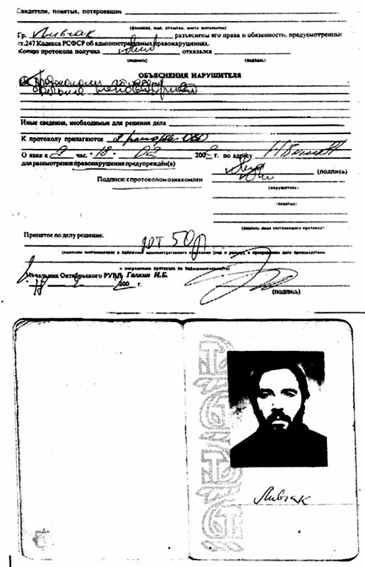 Поражает отношение работников милиции к служебным документам, куда они готовы внести любую чушь и явную бессмыслицу. Чего только стоит история с постановлением, где меня наказывают за будущие “грехи”. Такое впечатление, что никому из милицейских чинов и в голову не приходит, что какой-то гражданин может оспорить их действия.