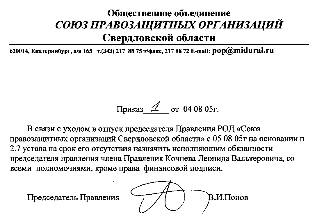 95 Насколько я понимаю, имеется в виду Л.В.Кочнев, которого Попов вскоре назначил и.о.председателя (см. приказ от 04.08.05). Вот, собственно, ради кого старался хитроумный Попов. Сначала сорвал выполнение работ по гранту, а теперь предлагает поставить во главу проекта своего человечка. Кстати, вот любопытная цитата, которая, возможно, многое объяснит: «Наши источники в Белом Доме рассказывают, что "королевской" пешкой в руках Багарякова оказался председатель ревизионной комиссии Свердловского регионального отделения СПС Леонид Кочнев… Личность Багарякова в "правых" кругах известна своей скандальной репутацией. Он - предприниматель из Нижнего Тагила …. Наши источники сообщают, что свой интерес в Багарякове имела администрация губернатора, которая всегда мечтала приручить правых, у которых высокие рейтинги в области. … Когда СПС и Яблоко ослабли, их недоброжелатели решили, видимо, что наступил удобный момент для удара. Как сообщил "Урал Паблисити Монитор" член политсовета СПС Владимир Попов, сочувствующий Кочневу, "в стане правых, кроме скандалов, ничего не происходит. …". Сегодня налицо очередной раскол в СПС. Наши источники … уверяют, что Попов - креатура областной власти. Он работает с уполномоченным по правам человека Татьяной Мерзляковой и именно он на данный момент по просьбе Багарякова контролирует Кочнева.» (UP-Monitor, Анна ДOHCKAЯ, http://www.upmonitor.ru/index.php?pg=lz&hid=149&PHPSESSID=966e7f85c4646716c9e14bf4290b795d)
