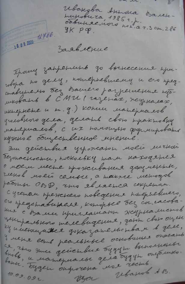 Прошу запретить до вынесения приговора по делу, потерпевшему и его представителю без Вашего разрешения публиковать в СМИ (газетах, журналах, интернете и т.д.) копии материалов уголовного дела, делать свою трактовку материалов, с их помощью формировать нужное общественное мнение. Эти действия угрожают моей личной безопасности, поскольку там находятся о моем месте проживания документы, членов моей семьи, а также методов работы ОВД, что является секретом. С учетом прежнего поведения потерпевшего, его представителя, которые без согласования с Вами приглашают журналистов центрального телевиденья, дают свою оценку имеющимся доказательствам в деле, у меня есть реальные основания опасаться, что эти действия будут выполнены вновь, и материалы дела будут опубликованы. Будет опорочена моя честь. 10.09.09 г. Иванов А.В. |