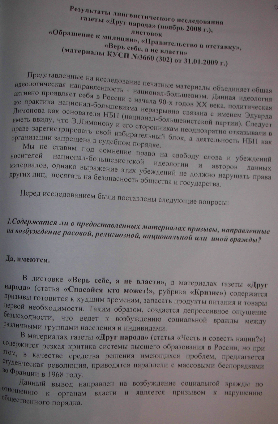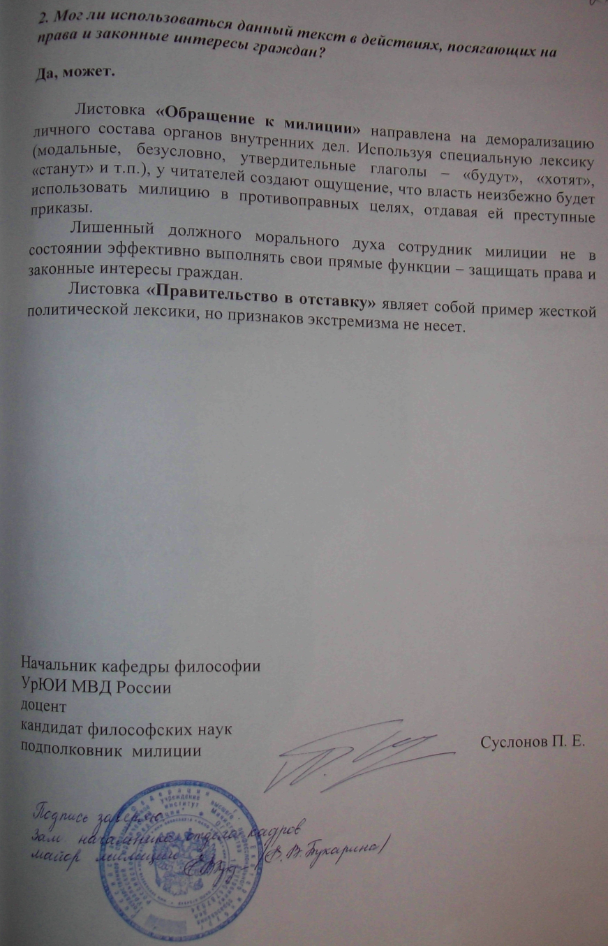 Павел Суслонов. «Результаты лингвистического исследования газеты «Друг народа» (ноябрь 2008 г.), листовок «Обращение к милиции», «Правительство в отставку», «Верь себе, а не власти» (материал КУСП №3660 (302) от 31.01.2009 г.)»